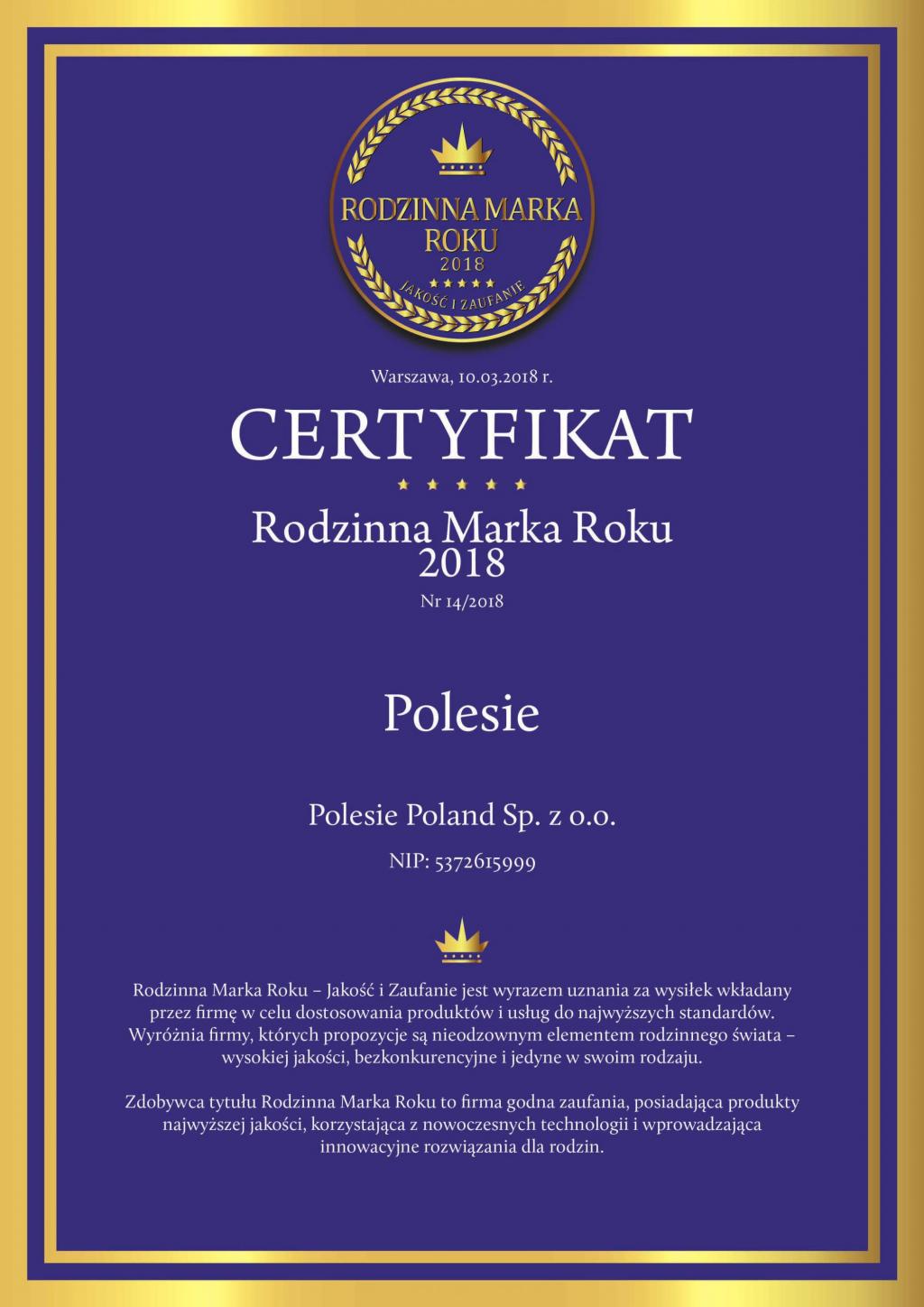 Мы рады сообщить, что марка Полесье удостоена звания и сертификата Семейная Марка 2018 Года в Польше. Звание Семейная Марка является выражением признания усилий компании Полесье в области улучшения качества товаров и услуг.Звание Семейная Марка присуждается Польским Институтом Развития Марки. Польский Институт Развития Марки занимается выявлением и награждением фирм, которые постоянно стремятся к улучшению стандартов, а также внедряют современные решения для удовлетворения потребностей самых требовательных клиентов.